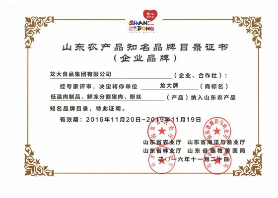 11月20日,山东省农业厅、海洋与渔业厅、林业厅、畜牧兽医局联合公布了《山东省首批知名农产品区域公用品牌和企业产品品牌名单》,体育博彩网站-亚洲体育博彩平台 生产的体育博彩 牌低温肉制品、体育博彩 牌鲜冻分割猪肉和体育博彩 牌粉丝三个产品入选《山东省首批知名农产品企业品牌目录》。